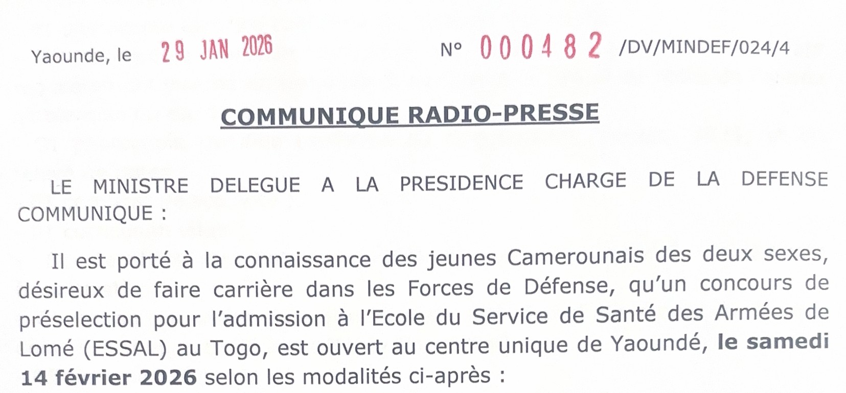 Concours de présélection pour l’admission à l’Ecole de Service de Santé des Armées de Lomé (ESSAL) au TOGO