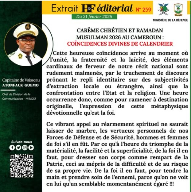 Ce vibrant appel au réarmement spirituel ne saurait laisser de marbre, les vertueux personnels de nos Forces de Défense et de Sécurité, hommes et femmes de foi s’il en fût. Par ce qu’à l’heure du triomphe de la matérialité, la facilité et la superficialité, de la foi il en faut, pour dresser son corps comme rempart de la Patrie, ceci au mépris de la difficulté et de au risque de sa propre vie. De la foi il en faut, pour tendre la main et prendre soin de l’ennemi, parce qu’on ne voit en lui qu’un semblable momentanément égaré.