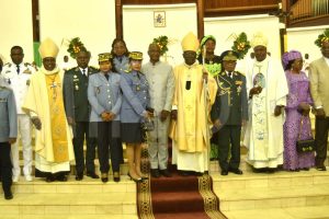 Before the start of the church service, in a heartwarming display of faith and unity, Defense and Security Forces, that is, personnel from the Presidential Guard, the National Gendarmerie, the Army, Airforce, Navy, Firefighter’s and the Police who gathered for a special worship service in the Basilica of Mary Queen of the Apostles took part in a procession which depicted a sense of community and camaraderie. This was followed by the solemn entrance of the national flag and singing of the national anthem by the faithful once more portraying that authority comes from God.